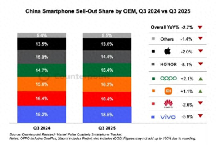 最近,知名机构Counterpoint Research,发布了2025年三季度,国内手机市场品牌排名以及份额的相关情况。