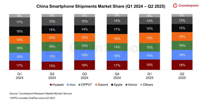 事实上,我们再看看2025年一季度,小米和华为一样是19%,OPPO是15%,苹果也是15%,VIVO是14%,荣耀是13%。